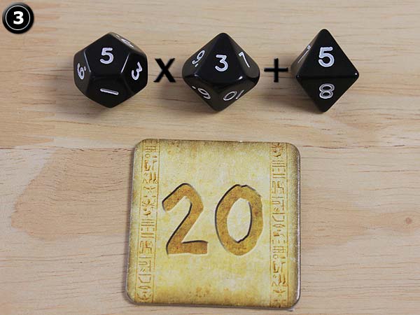Die Farbe steht außerdem für den Schwierigkeitsgrad die Zahl auf dem Skarabäus-Plättchen mit den 3 Würfeln zu erreichen. Die Zahl muss ein Spieler mit Hilfe der Würfel in Kombination mit den 4 Grundrechenarten (Addieren, Subtrahieren, Multiplizieren und Dividieren) genau erreichen.
