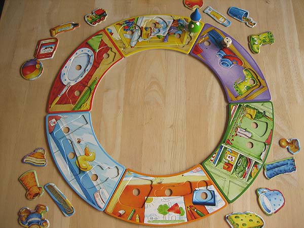 Jeder Teil des Spielplans stellt dabei einen Teil der Wohnung dar (Badezimmer, Kinderzimmer, Kleiderschrank,…) und beinhaltet je 3 Ausbuchtungen für Gegenstände.