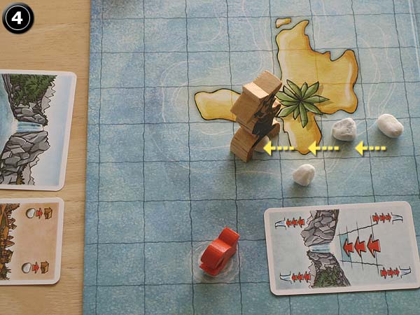 – Mit dem Startspieler beginnend decken die Spieler ihre Laufkarte auf und führen die darauf abgebildete Bewegung aus.