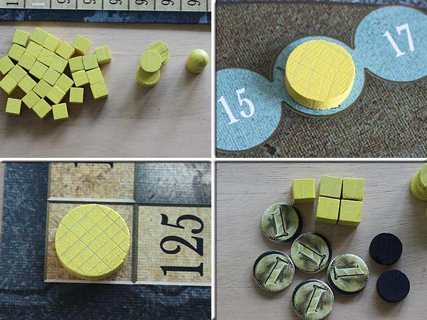 Toll und auf jeden Fall eine große Erwähnung wert sind die Plättchen und das Gold. Die Pappe aus denen diese sind ist nämlich unglaublich dick. Derart stabiles Material kenne ich sonst nur aus sehr viel teureren Jubiläums- oder Sondereditionen von Spielen.