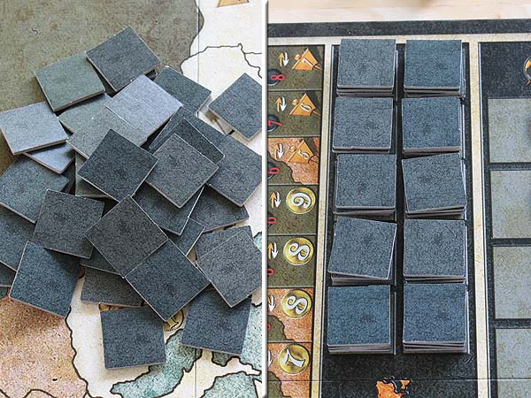 – Die Plättchen werden nach Rückseite/Epoche sortiert und verdeckt gemischt.