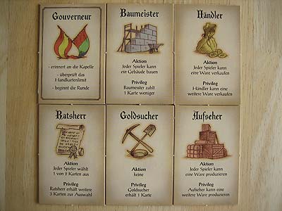Die Gouverneurskarte kennzeichnet den Startspieler und ermahnt diesen die Spieler an die optionale Benutzung der Kapelle und das Einhalten des Handkartenlimits zu erinnern. Der Baumeister, Händler, Ratsherr, Goldsucher und Aufseher sind Rollen die ein Spieler einnehmen kann. Jeder Spieler muss jede Runde eine Rolle einnehmen und diese verleiht dem Spieler einen besonderen Vorteil in der durch sie ermöglichten Aktion. Beim Baumeister muss ein Spieler zum Beispiel eine Handkarte weniger für den Bau eines Gebäudes bezahlen. |