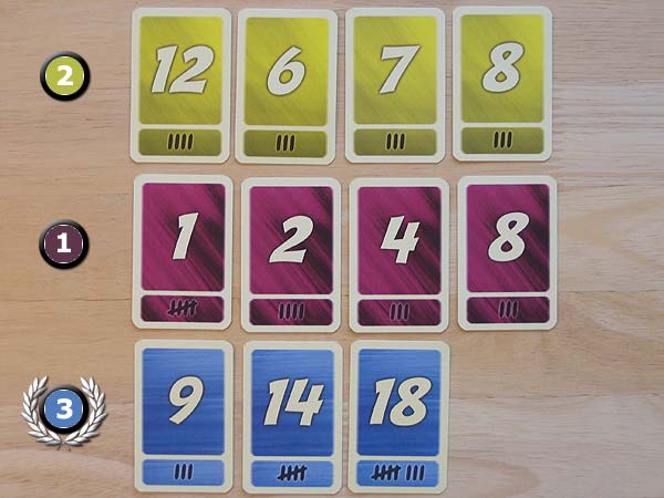 Jeder Spieler erhält einen identischen Satz von Zahlenkarten, d.h. jeder Spieler hat die Zahlen von 1 bis 18 zur Verfügung. Unten auf jeder Zahlenkarte sind Striche abgebildet. Pro Strich bekommt ein Spieler einen Siegpunkt. |