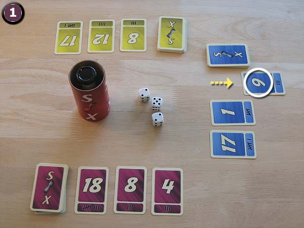 "Six" ist ein sehr einfaches und schnelles Würfelspiel. Die Schnelligkeit artet allerdings sehr schnell in Hektik aus. Der aktive Spieler versucht so schnell wie möglich zu würfeln, während die Anderen noch die genannte Summe mit ihren Zahlenkarten vergleichen.