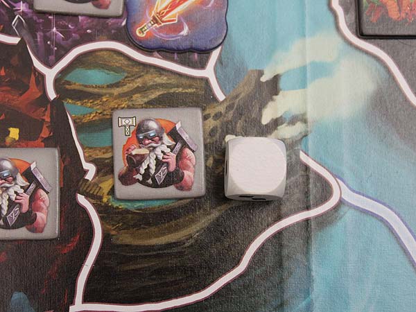 Es gibt noch sehr viele weitere Plättchen, welche zum Beispiel mit beliebten Orten ins Spiel kommen. Ein paar andere gehören zu Rassen oder Spezialfähigkeiten. Die Krone zeigt die aktuelle Runde und die schwarzen Berge heben die auf dem Spielplan zu sehenden Berge noch einmal hervor. |