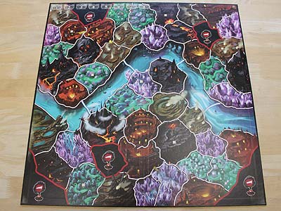 Für jede Spieleranzahl gibt es den passenden Spielplan. Hier abgebildet für 5 Spieler. Auf dem Spielplan sind verschiedene Regionen abgebildet: Gebirge, Sümpfe, Pilz-Wälder, Minen und Mystische Kristalle. Unabhängig von der gewählten Rasse und Spezialfähigkeit hat nur das Gebirge einen direkten Einfluss auf das Spiel, da es den Verteidigungswert der Region um 1 erhöht. Im Spiel geht es darum möglichst viele Regionen zu erobern, da jede Region ihrem Besitzer eine Siegmünze bringt. Der Fluss trennt das Spielfeld immer in 2 Hälften, er kann nicht besiedelt, wohl aber überschritten werden. |