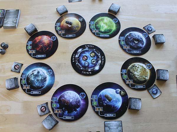 – Liegen nur noch Space-Plättchen im Stapel, dann werden diese offen neben den Planeten gelegt.