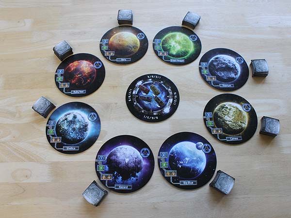 – Alle 12 Planeten werden verdeckt gemischt und zufällig 8 der 12 Planeten um das Jump Gate gelegt. Die restlichen 4 Planeten kommen aus dem Spiel.