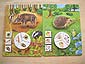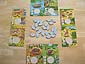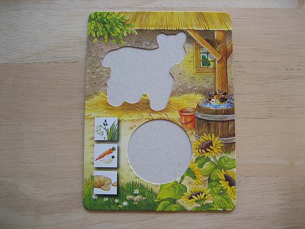 [1] Die Lebensraumkarte zeigt den Lebensraum des Tieres. Außerdem beinhaltet es oben einen Ausschnitt des Tieres, in dem dieses später hineingelegt wird. Unten auf der Karte befindet sich immer ein Kreis, in den immer 3 Futterstücke passen. [2] Das zum Lebensraum gehörende Tier passt genau in den Ausschnitt der Lebensraumkarte. [3] Die Futterstücke sind von der Größe her alle identisch. Ob ein Futterstück zur Lebensraumkarte gehört, lässt sich daher durch die 3 links vom Kreis abgebildeten Futterstücke erkennen. |