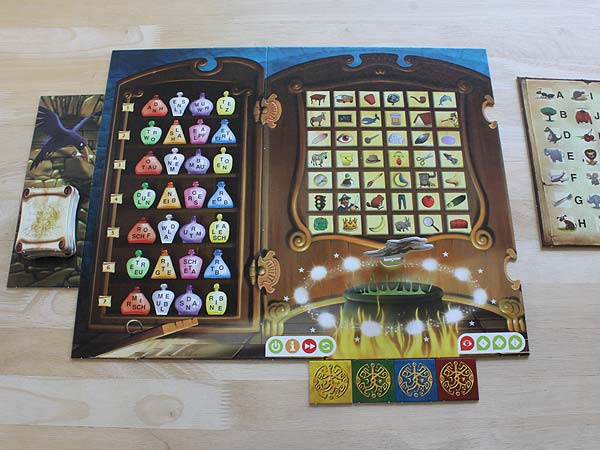 Es gibt jeden Buchstaben des Alphabets doppelseitig bedruckt, d.h. auf der einen Seite groß- und auf der anderen Seite kleingeschrieben. Dazu noch ein paar weitere Buchstabenfolgen. Im Spiel gibt es eine Aufgabe, bei der ein Spieler im Zauberschrank mitgeteilt bekommt, welche Buchstabenplättchen er nehmen muss, um daraus ein Wort zusammenzusetzen. |