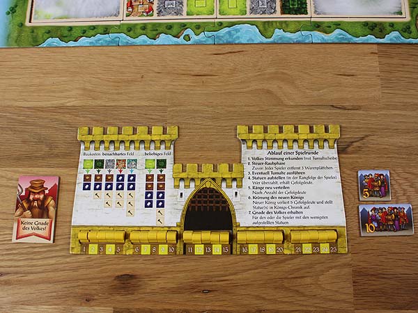 Zwischen den beiden Türmen legt ein Spieler seine Adelskarte und zeigt so an, welche Spielerposition er in der aktuellen Runde hat. Links auf der Burgtafel befindet sich eine Übersicht über die Baukosten pro Feldart. Rechts wird der Ablauf einer Spielrunde kurz beschrieben. Unten kommen in jede der 5 Bereiche 5 Statuen des Spielers. Die Zahl darunter zeigt an, wie viele Statuen ein Spieler schon errichtet hat. |