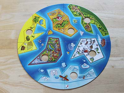 Der Spielplan zeigt 6 Urlaubsgebiete unterschiedlicher Form und Art. Die Art ist im Spiel nicht relevant, aber die Form. Die Spieler müssen nämlich das zum Urlaubsort gehörende Tier blind hineinstellen bzw. daraus nehmen. Welches Tier zu welchem Urlaubsort gehört wird durch die Tierchips festgelegt, welche in die Löcher gelegt werden, und blind sind die Spieler, weil sie die Sonnenbrille aufhaben durch die sie nichts sehen können. |