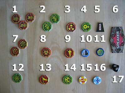 Teil 2 der restlichen Marker, Würfel und Strategiekarten.