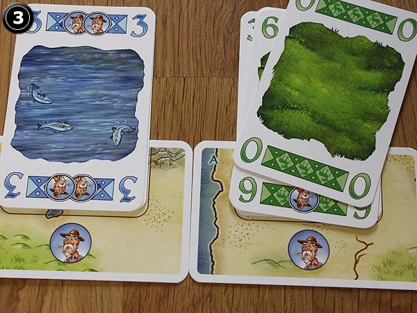 – Die Farbstapel werden von A nach E auf die Ländereien verteilt. Liegt auf einer Länderei schon eine Farbe, die man gerade gewonnen hat, so müssen diese Karte auf die schon liegenden Karten gleicher Farbe gelegt werden.