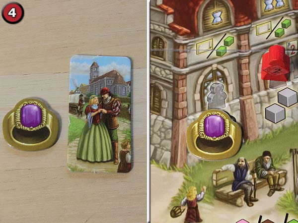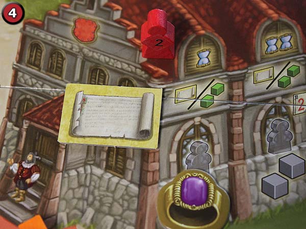 – Eine Spielfigur vom Hof auf die erste Stufe des Rathauses setzen oder eine Spielfigur im Rathaus eine Stufe weiterziehen.
