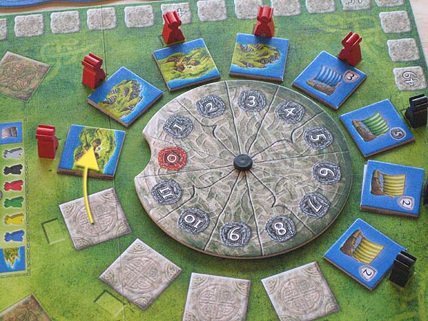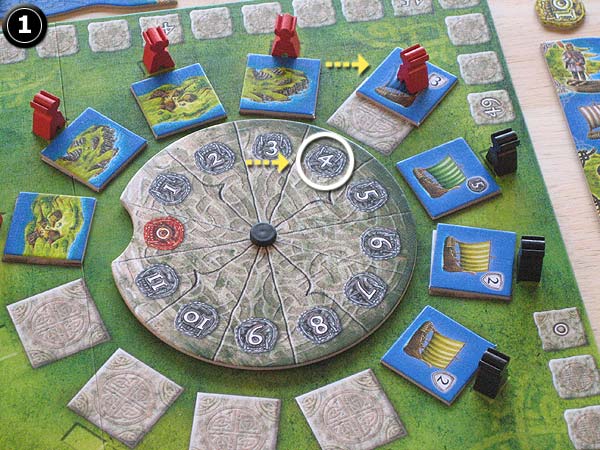 – Die Insel- und Schiffsplättchen werden an das Drehrad gelegt.