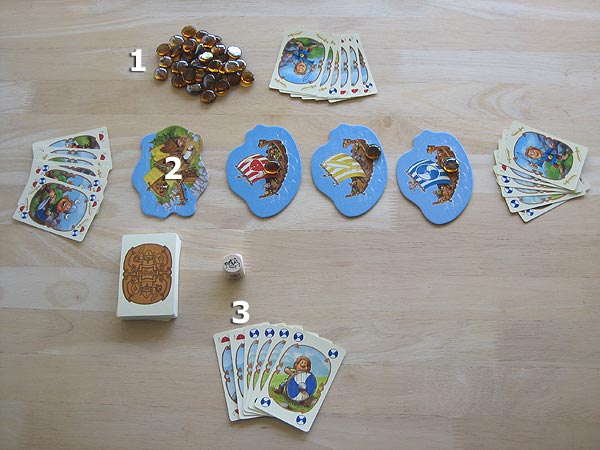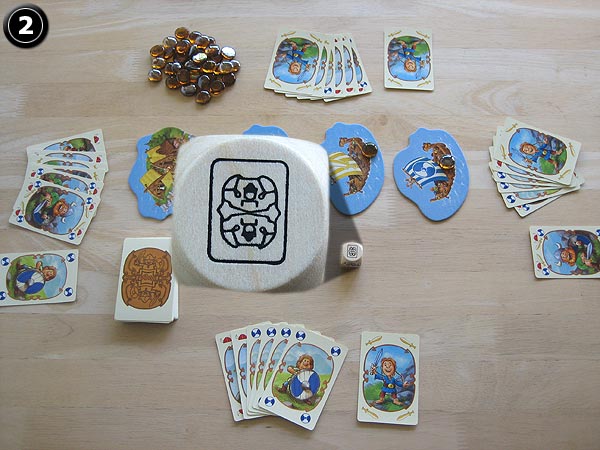 – Ist ein Spieler an der Reihe, so würfelt er und führt die gewürfelte Aktion aus. Mögliche Aktionen sind: 1 Edelstein auf das gelbe, blaue oder rote Schiff legen, 1 Ausrüstungskarte ziehen oder das vorderste Schiff kommt am Wikingerdorf an und die Spieler bieten um die Ladung.