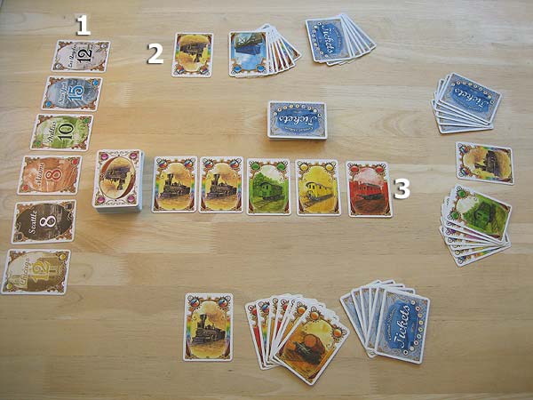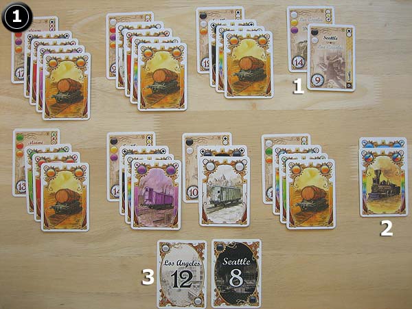 – 5 zufällige Wagenkarten werden aufgedeckt. Der Rest bildet den Nachziehstapel.