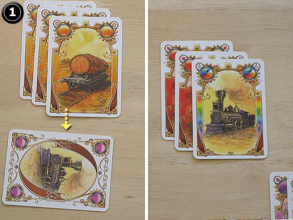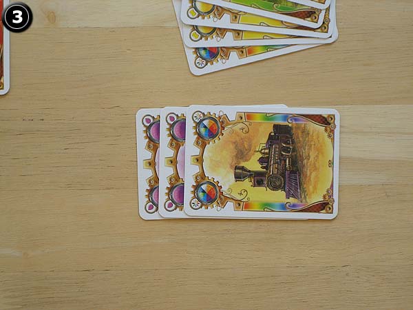 2) Karten ausspielen. Ein Spieler kann entweder 3 Karten mit unterschiedlichen Farben ausspielen (Lokomotiven dürfen hier nicht eingesetzt werden) oder beliebig viele Karten einer Farbe in Verbindung mit Lokomotiven. Lokomotiven müssen dabei immer oben auf liegen.